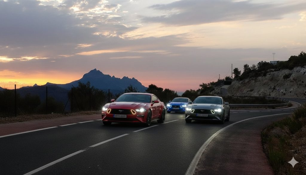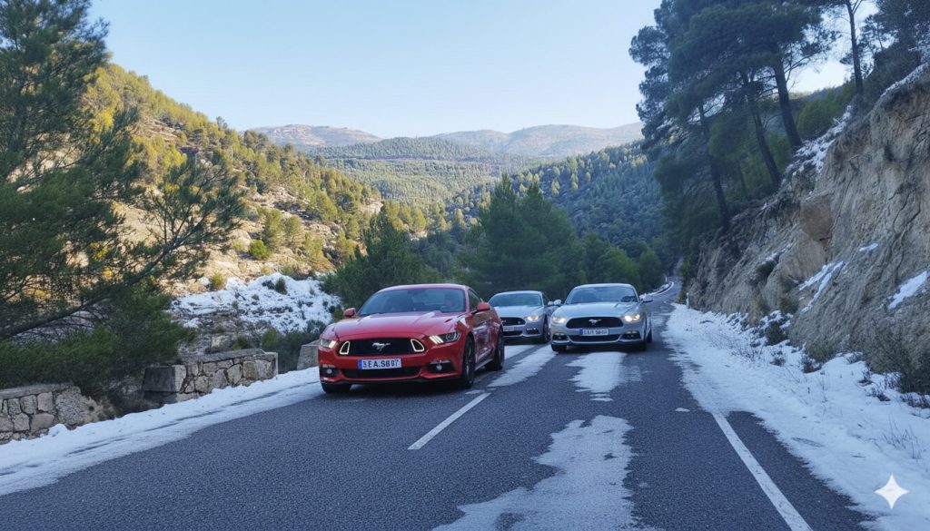 Estado de la carretera: La CV-770 es más estrecha y técnica (muchas horquillas), mientras que la CV-70 es más rápida y “amigable para Mustang”, con más espacio para que los V8 rugan.